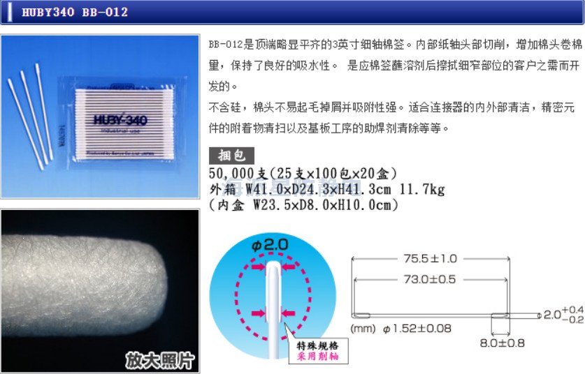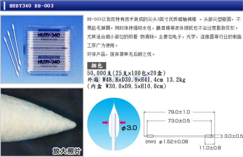 | 日本HUBY | BB-013 | 3寸 | 25只/包,100包/盒,20盒/箱 | 3"雙頭棉簽、細、硬質(zhì)尖頭,白色紙桿 |