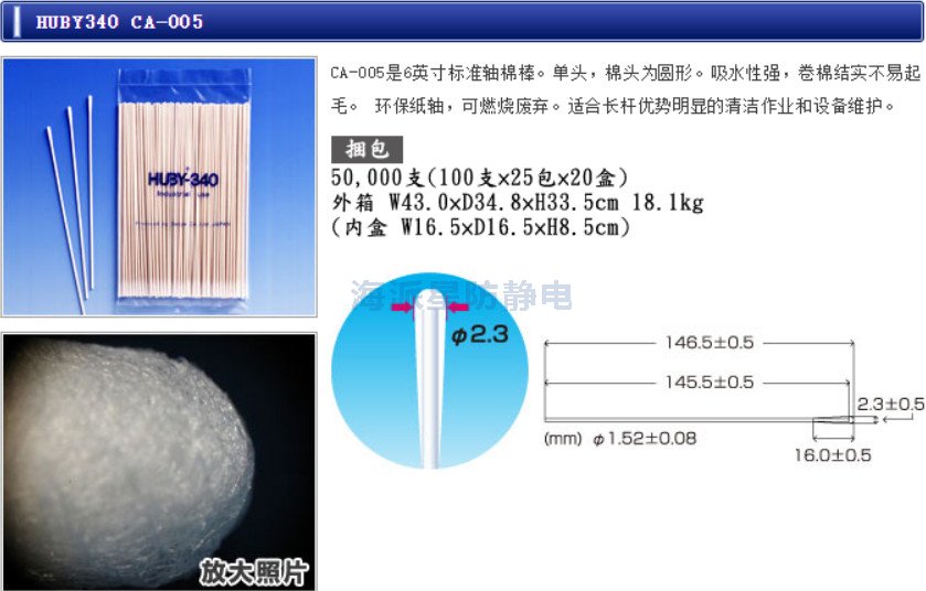 | 日本HUBY | CA-005 | 6寸 | 100只/包,25包/盒,20盒/箱 | 6"單頭棉簽、方頭,白色紙桿 |