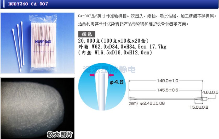 | 日本HUBY | CA-003 | 3寸 | 25只/包,50包/盒,20盒/箱 | 3"雙頭棉簽、錐形尖頭,白色紙桿 |
