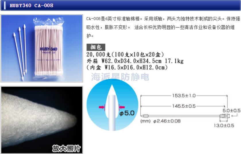 | 日本HUBY | CA-008 | 6寸 | 100只/包,10包/盒,20盒/箱 | 6"雙頭棉簽、錐形尖頭,白色紙桿 |